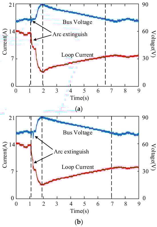 The waveform when the series arc occurs on the bus. (a) Without the proposed method. (b) With the proposed method.