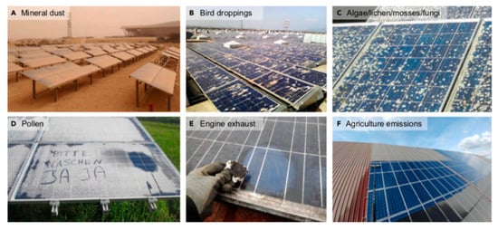 Different types of soiling: (A) mineral dust in a desert; (B) bird droppings; (C) algae, lichen, mosses, or fungi; (D) pollen in wet and moderate climates; (E) engine exhaust from an industrial area; and (F) agricultural emissions (Reprinted with permission from Ref. []. 2019, Elsevier).
