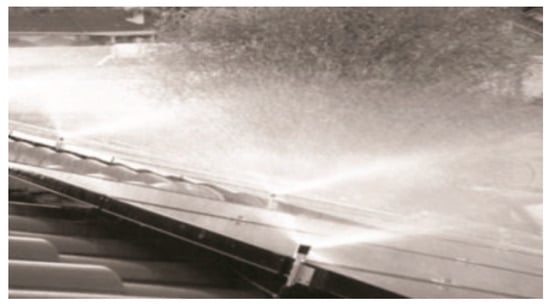 Figure 6 depicts water cleaning using channeled flowing water on the PV panel surface to eliminate dust accumulation. This technique requires substantial water volumes and often involves pumping water to the required height. In some cases, pressurized water is combined with detergents to improve dust removal efficiency. However, the challenge of water scarcity in certain regions limits the feasibility of this approach [].