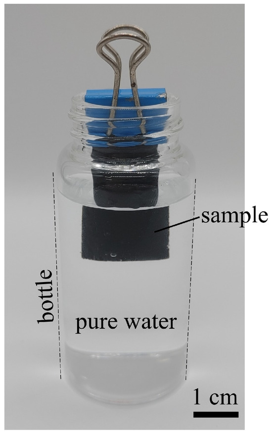 To generate electricity, it is first necessary to confirm the ability of CNTCP to absorb liquid and obtain sufficient performance. Therefore, we evaluated several CNTCP samples of different pulp materials and drying methods to determine the optimal absorption ability of CNTCP. Previous CNTCP samples were fabricated using eucalyptus pulp and a heat press as the drying method. In this study, we fabricated CNTCP samples using eucalyptus or rayon as the pulp material and a heat press or oven as the drying method. By changing the above conditions, four types of CNTCP samples were fabricated, as shown in Table 1. These samples were placed in a bottle filled with pure water, as shown in Figure 2. The absorption abilities under different conditions were compared by measuring the changes in overall weight.