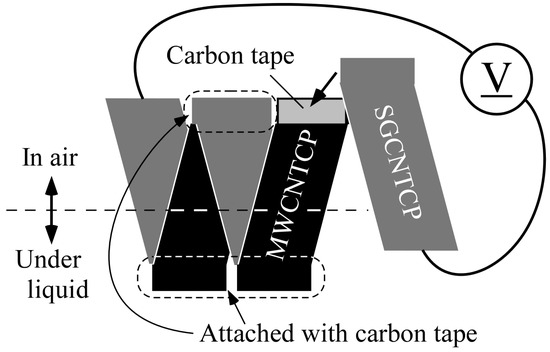 Generally, thermoelectric-power-generating material can be connected electrically in series and thermally in parallel to obtain more output from a single heat source. Taking advantage of the easy cutting and pasting properties of CNTCP, a multisheet structure was constructed, as shown in Figure 4. CNTCP consisting of multiwalled CNTs (MWCNTCP) was connected in series to the SG101-CNT composite paper (SGCNTCP) to form our transpiration-type thermoelectric-power-generating paper. The Seebeck coefficient of MWCNT tended to be lower than that of SGCNT. When fabricating thermoelectric-power-generating material, p-type and n-type semiconductors are generally combined; however, this can be achieved with two different materials with different Seebeck coefficients. The stability of n-type semiconducting CNTCP remains an issue, so we combined SGCNTCP and MWCNTCP. We used MWCNTs (NC7000, Nanocyl SA, Sambreville, Belgium) and eucalyptus pulp to fabricate MWCNTCP. The fabrication method is the same as that mentioned in Section 2.1. The Seebeck coefficient of MWCNTCP was around 15 V/K. Conductive carbon tape was also used to connect SGCNTCP to MWCNTCP.