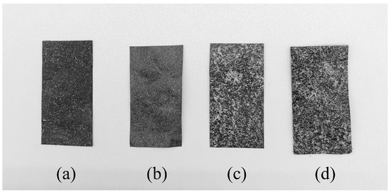 Fabricated CNTCP samples to evaluate their absorption ability. Samples were fabricated under conditions listed in Table 1: (a) sample 1, (b) sample 2, (c) sample 3, and (d) sample 4. Each sample was prepared as a 3.0 × 1.5 cm sheet (actual size varied due to manual preparation).