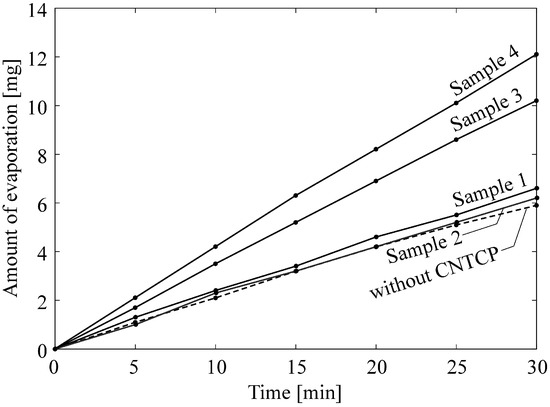 We prepared samples 1 to 4 on the basis of the CNTCP fabrication method described in Section 2.1 and under the conditions listed in Table 1. Figure 5 shows photos of the fabricated samples. These CNTCPs were evaluated for their water absorption ability. Figure 6 shows the results of the measurements described in Section 2.2 for 30 min. For comparison, the measurement results without CNTCP are also shown. This suggests that CNTCP made from rayon pulp has excellent absorption ability. It was also found that the absorption ability further improved by drying in an oven instead of using a heat press. This suggests that heat pressing reduces the space inside CNTCP, suppressing capillary action.