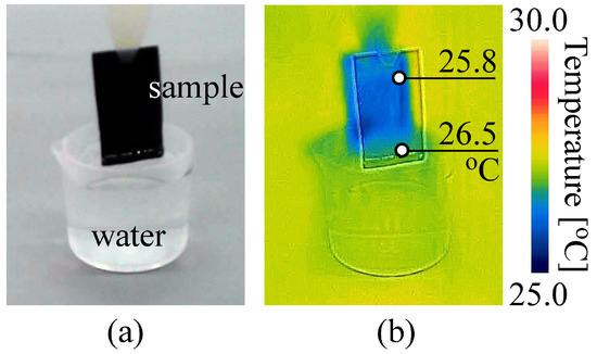 To conduct thermoelectric power generation without a heat source, one end (bottom) of a sample was placed below the water level in a jar, and the other end (top) was fixed above the water level, as shown in Figure 3. The temperature at the top was expected to be lower than at the bottom due to the heat of vaporization caused by the evaporation of water absorbed through capillary action. To confirm the occurrence of temperature differences within the sample, two-channel thermometer probes (LR5021, HIOKI E.E. CORPORATION, Ueda, Japan) were placed at the top and bottom of the sample, and the temperature of the sample surface was observed with a thermal imaging camera (FLIR One Pro, Teledyne FLIR LLC, Wilsonville, OR, USA). We did not force the liquid to evaporate by blowing air on the sample to obtain more heat of vaporization. The temperature at the bottom of the sample is calculated as [°C], and that at the top is calculated as [°C]. The Seebeck coefficient is calculated from the difference in temperature and the generated electromotive force.