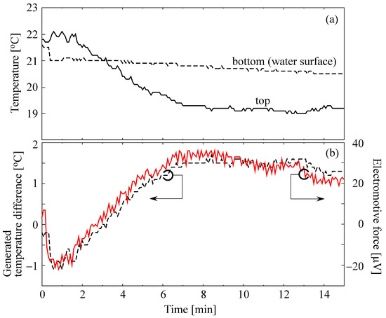 On the basis of the results in Section 3.1, a CNTCP sample was prepared by using rayon pulp and drying it in an oven to fabricate our transpiration-type thermoelectric-power-generating paper. Figure 7 shows an example of the results of the temperature difference generated in a sample by capillary action and the generation of vaporization heat, using a thermal imaging camera. The result confirmed that the sample spontaneously generated a temperature difference as desired. Figure 8 shows the temperature change during 15 min of measurement at the top and bottom of the sample and the change in generated electromotive force. From the results, a maximum temperature difference of 1.7 °C was generated between the top and bottom (water surface) of the sample due to the heat of vaporization at room temperature, generating an electromotive force of 36 V. The Seebeck coefficient at this time is estimated to be about 21.2 V/K. Figure 9 shows a correlation diagram between the generated temperature difference and the electromotive force. The data indicate that the sample generates an electromotive force that depends on the temperature difference it spontaneously generates. Therefore, these suggest the feasibility of a new type of thermoelectric generation device that uses capillary action and heat of vaporization to spontaneously generate a temperature difference and generate electricity.