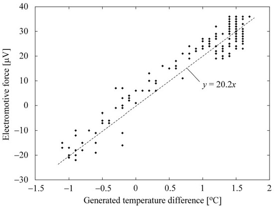 Correlation diagram between generated temperature difference and electromotive force. The dashed line indicates curve fitting.