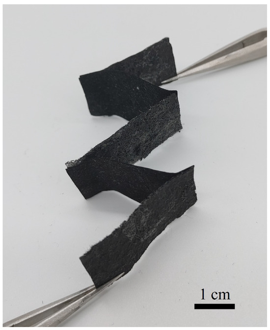 Figure 10 shows our multisheet transpiration-type thermoelectric-power-generating paper fabricated by the procedure described in Section 2.4. It is lightweight and flexible even with multiple sheets due to the CNTCP properties. Table 2 lists the measurement results when three to five SGCNTCP sheets were used with MWCNTCPs placed between each SGCNTCP, as explained in Section 2.4. Conductive carbon tape was used to connect each CNTCP. We confirmed that the output obtained by increasing the number of sheets was larger: 137.5 V per 1 °C temperature difference for that of three sheets and 178.0 V per 1 °C temperature difference for that of five sheets. This indicates the feasibility of our multisheet transpiration-type thermoelectric-power-generating paper.