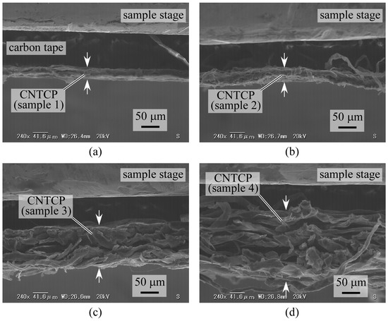 Based on the experimental results presented in Section 3.1, CNTCP has the ability to absorb water, and rayon pulp, which has excellent absorption properties, can improve the water absorption ability of CNTCP. It was also found that drying in an oven, rather than using a heat press, was more effective in improving water absorption. Here, we used SEM to observe and evaluate the cross-sectional shape and thickness of the samples (Figure 11). From the results, it was found that the samples with eucalyptus pulp (samples 1 and 2) had similar cross sections regardless of the drying method. This suggests that the shape was determined to some extent at the point of dehydration in the papermaking process (Figure 1b). In both cases, there is little internal space for the occurrence of capillary action, which is also consistent with the results of Figure 6. On the other hand, for the samples with rayon, it was confirmed that clear differences in cross-sectional shape and thickness appeared as expected, depending on the drying method. In particular, it can be said that the sample dried by oven (sample 4) has an overall internal space configuration that is better suited for the occurrence of capillary action. In other words, this is thought due to the fact that the use of a heat press causes the pores inside CNTCP with rayon to collapse, making capillary action less likely to occur (sample 3). Therefore, it is important to select pulp material with good absorption properties and an appropriate fabrication method that does not collapse the internal pores to fabricate transpiration-type thermoelectric-power-generating paper.