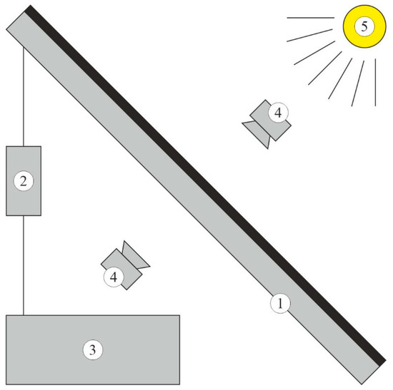 Diagram of the experimental stand: 1—photovoltaic panel; 2—charging regulator; 3—gel battery; 4—infrared camera; 5—sunlight.