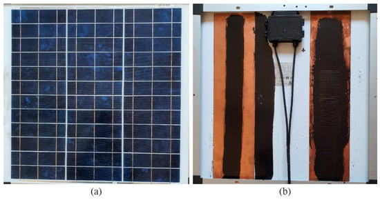 (a,b) Views of a tested PV panel, model MP-30WP: (a) view from the top side; (b) view from the bottom side.