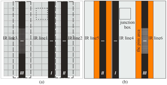 (a,b) Schematic diagrams of the opposite sides of the PV panel: (a) view from the top (sunlight) side; (b) view from the bottom side. The copper sheets are marked in dashed lines (a) and orange areas (b). Black colour indicates areas covered with black paint; I—bare PV panel surface, II—smooth copper sheet surface, III—copper sheet surface with pins, lines numbered from 1 to 6 along which temperature data were taken into consideration in the further analysis are indicated.