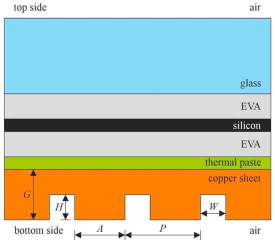 Two types of modifications of the outer surface using copper sheets (in contact with ambient air) were simultaneously investigated, which differed in surface roughness. One was characterised by the nominal roughness of the copper sheet according to its manufacturer. This copper sheet was named ‘smooth’. The other copper sheet, named ‘with pins’, was characterised by a mechanically modified outer surface due to milling. The pins were manufactured with a CNC machine to achieve a depth of 0.5 mm and a width of 4 mm, spaced every 5 mm. Both copper sheets were connected to the bottom part of the PV panel using a thermal paste with a conductivity coefficient equal to 0.78 W/(mK) [14]. Figure 4 illustrates the components of the PV panel according to its manufacturer [15]. The milled pins formed squares with a side length of 4 mm. Figure 4 shows a cross-section diagram, in addition to the typical elements (a protective glass panel; EVA (ethylene–vinyl acetate) foil layers provided by the manufacturer; a silicon layer; and a thermal paste layer). The arrangement of pins in the copper sheet is also shown, with the dimensions of the pins set as A = 4 mm, H = 0.5 mm, W = 1 mm, and P = 5 mm.