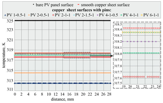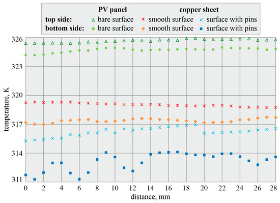 Figure 5 shows the experimental data for temperature measurement using infrared thermography. The local temperatures recorded on the top and bottom sides of the PV panel are provided at the central line of each area chosen for the analysis (for a bare panel surface, a panel with a copper sheet with a smooth surface, and a panel with a copper sheet with pins).