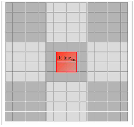 The schematic diagram indicating the location of the selected area of the PV panel in relation to its entire surface with a red square; an example of the line along which temperature data were taken into account in the further analysis is shown (see Figure 3).