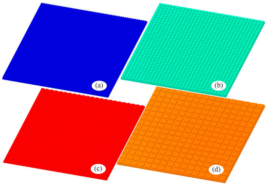 Views of selected copper sheet surfaces with pins: (a) PV 1-0.5-1, (b) PV 2-0.5-1, (c) PV 2-1.5-1, and (d) PV-4-1-1; the geometric parameters of the surfaces are listed in Table 4.