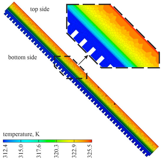 Temperature distribution in the longitudinal section of the selected PV panel with copper sheet surface with pins, PV 1-0.5-1 (the fine mesh size was used in numerical calculations).