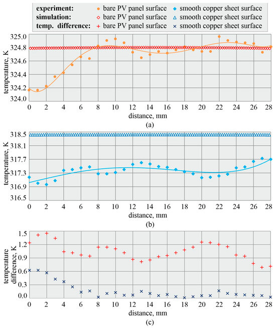 (a,b) Temperature distribution relative to the length of the selected lines on the outer surfaces of the PV panel, obtained experimentally and through numerical simulations; results for two selected series, with (a) a bare PV panel and (b) a PV panel with a smooth-surface cooper sheet; (c) temperature differences obtained experimentally and through numerical simulations based on the results for a bare PV panel and a PV panel using a copper sheet with a smooth surface.
