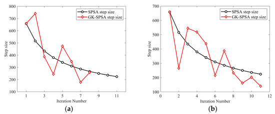 Analyzing the trend in Figure 9, with the increase in iteration times, the search step sizes of GK-SPSA and SPSA decrease continuously. This reduction effectively reduces the oscillations around the optimal value. In addition, small fluctuations in the GK-SPSA step size indicate that GK-SPSA is capable of evaluating the current state of the optimization process and adjusting the step size according to the current optimization state.