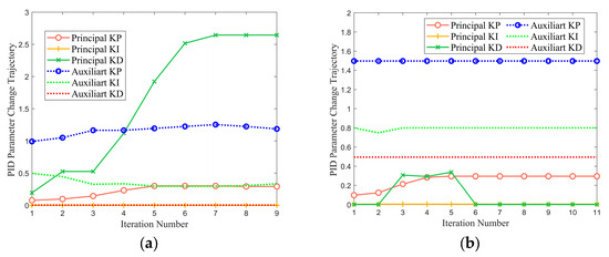 The adjustment of these essential controller parameters signifies the continuous enhancement of the control system’s performance. The controller parameter path is visually traced in Figure 10, revealing that, as the optimization process progresses, the controller parameters will continue to change dynamically, and the controller parameters at adjacent iteration points will not be the same. Throughout the iteration process, the parameters of each controller undergo changes. However, these changes are relatively minor, resulting in subtle variations in the parameters as depicted in Figure 10b.