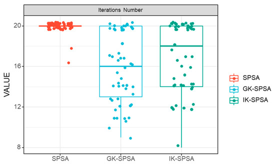 The comparison of the number of iterations of SPSA, GK-SPSA, and IK-SPSA is shown in Figure 12. First, the average iterations of SPSA are 20 times and the scatter points of the iterations are relatively concentrated, while the box lengths of GK-SPSA and IK-SPSA are both larger than SPSA and the mean iterations are smaller than SPSA. Note that both of these methods can improve the performance of SPSA. Secondly, the comparison between GK-SPSA and IK-SPSA shows that the average number of iterations of GK-SPSA is still smaller than that of IK-SPSA when both outliers exist, indicating that GK-SPSA can find the best advantage faster and reduce the experiment cost to a greater extent.