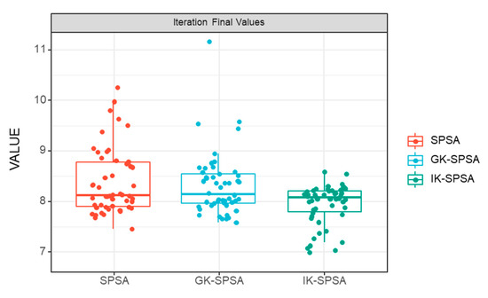 The comparison of the iteration final values of the three optimization methods is shown in Figure 13. As shown in Figure 13, the final iteration values of SPSA and GK-SPSA are similar and higher than for IK-SPSA. In addition, it can also be observed that there are some outliers that deviate from the mean value in GK-SPSA optimization. Even in this case, the overall box diagram is still flatter than for the SPSA method. This phenomenon shows that the stability of the overall value is superior. It can be concluded that the optimization results obtained by the optimization method are more reliable and less likely to cause abnormal conditions in the control system.