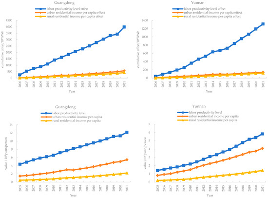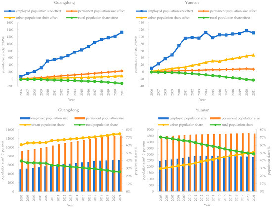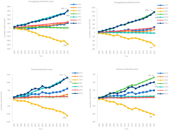 - Except for the carbon emission intensity effect and urban–rural population structure effect, all other cumulative effects contributed to the growth of total final electricity consumption in Guangdong and Yunnan during 2005–2021. The industrial labor productivity level effect is the primary driver that increases total final electricity consumption (Guangdong: 3988 × 108 kWh or 78.5%, Yunnan: 1315 × 108 kWh or 87.1%), and industrial carbon emission intensity effect is the primary driver that decreases total final electricity consumption (Guangdong: −3828 × 108 or −75.3%, Yunnan: −1092 × 108 kWh or −72.3%). The industrial energy consumption intensity effect and employed population size effect are the second and third drivers that increase industrial electricity consumption in Guangdong, while the industrial electrification level effect and industrial energy consumption intensity effect are the second and third drivers that increase industrial electricity consumption in Yunnan. The industrial structure effect in Guangdong shows an upward and then a downward trend, while in Yunnan, it shows an upward trend during 2005–2021;