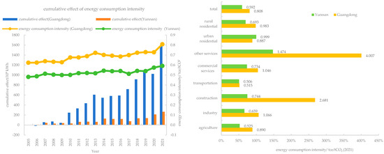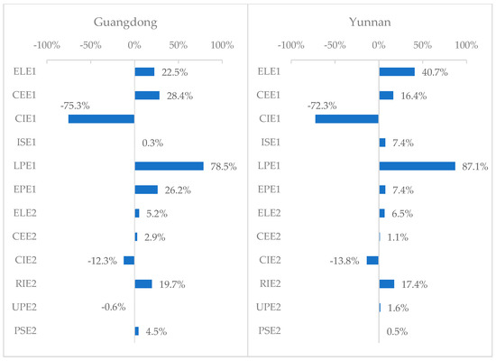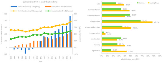 - Increasing the electrification level in sectors with a high share of fossil energy consumption is urgent. Guangdong is the largest province in terms of energy consumption and carbon emissions. Yunnan’s end-use energy consumption has a high proportion of fossil energy consumption, and its overall electrification level is much lower than Guangdong’s. In the context of the carbon-neutral strategy, both provinces are under tremendous pressure to control energy consumption and reduce carbon emissions. Further promoting the implementation of an electricity substitution policy can be less effective for final fossil energy consumption and improve the electrification level in industry, transportation, construction, and other sectors. The electrification rate has more room for improvement in Yunnan;