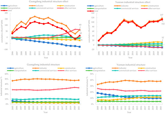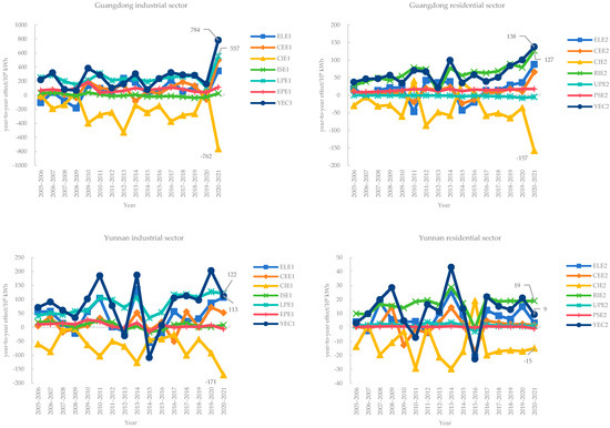 - During the period of 2005–2021, the total final electricity consumption growth in Guangdong (5093 × 108 kWh) is much higher than that in Yunnan (1510 × 108 kWh), but the average annual growth rate in Guangdong (7.1%) is lower than Yunnan (9.0%). The industrial sector accounted for a primary share of total final electricity consumption relative to the residential sector, and the share of industrial electricity consumption went down slowly in Guangdong and fluctuated in Yunnan. In addition, the growth of industry subsector electricity consumption is the main contributor to growth in total final electricity consumption, but the share of industry subsector electricity consumption went down slowly both in Guangdong and Yunnan;