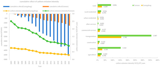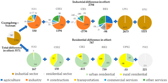 - The total difference in effect between Guangdong and Yunnan was 3571 × 108 kWh, of which 2784 × 108 kWh (78.0%) for the industrial sector and 787 × 108 kWh (22.0%) for the residential sector and the industrial labor productivity level effect. The largest positive difference lies in the industrial labor productivity level effect, which widens the gap in electricity consumption by 2673 × 108. The largest negative difference lies in the industrial carbon emission intensity effect, which narrows the gap in electricity consumption by −2737 × 108 kWh, mainly caused by the industry subsector (−2186 × 108 kWh). The difference in each effect between the two provinces is mainly determined by change in the corresponding driver and change in subsectoral electricity consumption. The average effect of change in driver varies considerably across different subsectors, helping to understand the difference in effect between Guangdong and Yunnan.