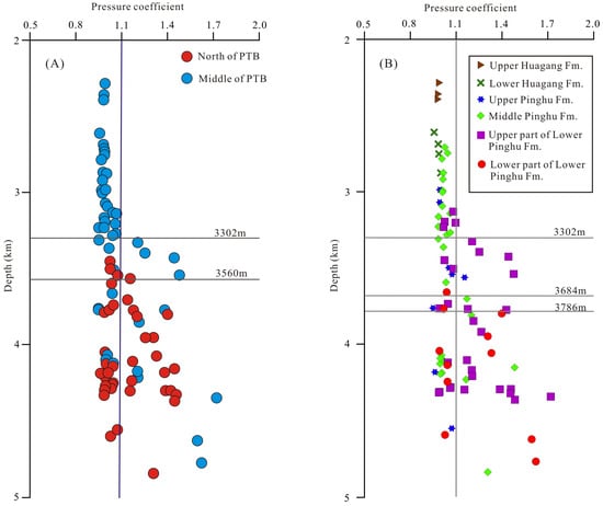 - The distribution characteristics of formation pressure measured using the DST show that in the vertical direction, overpressure is mainly located in the lower section of the Pinghu Formation, with a pressure coefficient in the 1.1–1.7 range and a pressure relief feature. On the plane, the pressure coefficient in the Pingzhong area is higher than that in the Pingbei area.