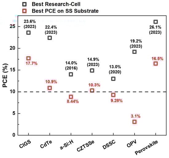 The best research-cell efficiencies and power conversion efficiencies (PCE) of SS substrates for thin-film solar cells, including a-Si:H, CZTSSe, CIGS, CdTe, DSSC, and OPV, are graphically shown in Figure 1 [,,,,,,].