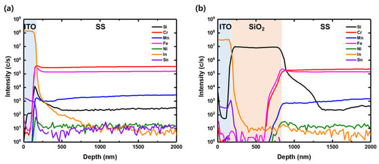 This specific technique parallels practices in the fabrication of CZTSSe or CIGS solar cells, where processing temperatures typically fall in the range of 450–550 °C [,]. To substantiate the effectiveness of our impurity diffusion barrier, we conducted ITO deposition and annealing with and without SiO2, followed by D-SIMS measurements. As shown in Figure 3, the outcomes confirmed that in the absence of SiO2, impurities including Fe and Cr infiltrated the ITO layer. In contrast, in the presence of SiO2, it acted as a robust diffusion barrier, successfully preventing impurities from infiltrating the ITO layer. This highlights the pivotal role of SiO2 as an effective inhibitor of impurity diffusion in solar cells.
