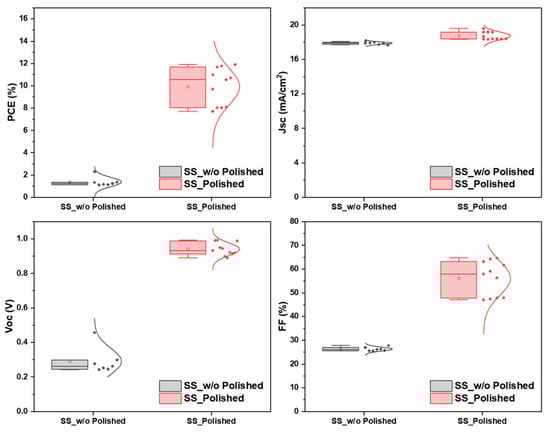 Parameters extracted from light J–V curve of perovskite solar cells on w/o polished and polished SS substrates. The parameters of each cell are indicated with dots, and their distribution is indicated with lines and boxes.