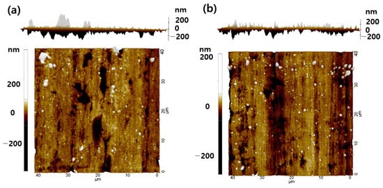 To address this challenge, solar cells were fabricated on polished substrates, leading to a substantial increase in efficiency of up to 11.9% (Figure 4). The most notable enhancements were observed in VOC and FF, primarily attributed to the improved smoothness of the SS substrate, as confirmed by AFM measurements shown in Figure 5. Through AFM measurements, the roughness and morphology of the sample surface can be confirmed. Upon examining Figure 5a,b, a discernible vertical pattern is evident. This particular configuration aligns with findings in the literature [], leading to the conclusion that the polishing process for this sample was exclusively conducted in the vertical direction. In particular, a detailed roughness analysis considering the peak roughness (Rp = peak height–valley depth), roughness variation (RMS), and average roughness (Ra) revealed that the polished substrate exhibited a roughness level more than double that of the original substrate (Table 2).