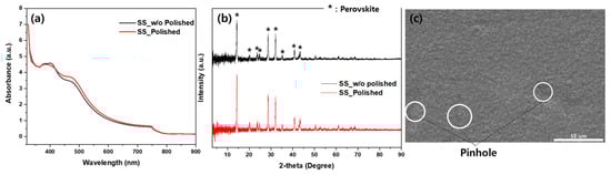 We conducted absorbance, XRD, and SEM measurements to investigate the properties of the perovskite thin film (Figure 6). The results indicate that the perovskite thin film is well-formed, as evidenced by the absorbance and XRD analyses. However, SEM images reveal the presence of pinholes in the perovskite thin film. These pinholes are observed to act as defects, exerting an influence on both VOC and FF. This suggests that the defects introduced by the pinholes have a discernible impact on the electrical characteristics of the perovskite solar cells, affecting both VOC and FF. Consequently, SS substrate roughness is a critical fact, highlighting its significance in shaping the overall performance of perovskite solar cells.