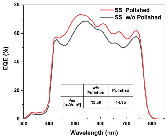 EQE results of perovskite solar cells on w/o polished and polished SS substrates.