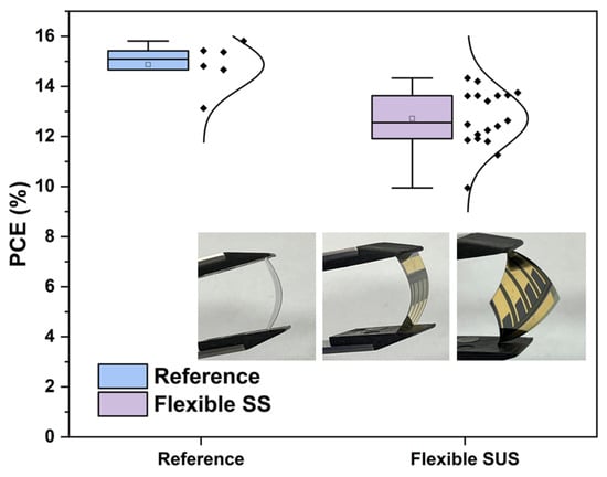 PCE results of reference (glass substrate) and flexible substrates. The PCE values of each cell are indicated with dots, and their distribution is indicated with lines and boxes.