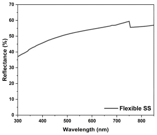 First, flexible stainless steel (SS) substrates undergo a planarization process during manufacturing through a roll-to-roll method. This process leads to a notable improvement in surface roughness. Specifically, it has been reported that the roughness is reduced to Rp = 8.9 nm []. Additionally, studies on the fabrication of Copper Indium Gallium Selenide (CIGS) solar cells on flexible SS substrates indicate RMS of approximately 13.6 nm []. An examination of the actual reflectance of the flexible SS substrate utilized in our experiments revealed consistently high reflectance across the entire wavelength spectrum, as shown in Figure 10. The high efficiency of flexible SS substrates is thought to be due to the following reasons. This diversification in substrate options underscores the adaptability of perovskite solar cell technology and its potential for tailoring solutions for various applications.