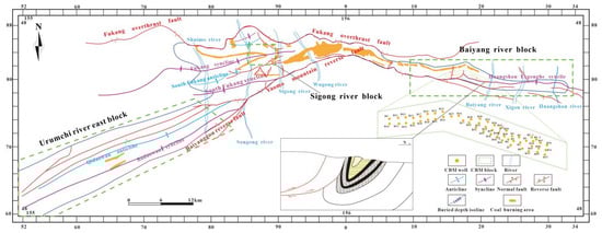 The target area of this research is the Baiyang River development pilot test area (BYR block for short) located in the Fukang Fault Belt. The BYR block is distributed in a nearly east–west direction with an area of about 18.23 km2 and is located in the north wing of the Huangshan–Ergong River inverted syncline. In general, the BYR block is a southward-dipping monoclinal structure with a dip angle of 30°–58° and an average of 46°. The coal-bearing strata show little change in strike and inclination (Figure 1). The northern and southern boundaries of the block are controlled by the Fukang overthrust and Yaomoshan reverse fault.