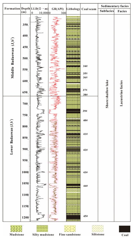 The main coal-bearing strata in the study area were the lower and middle parts of the Badaowan Formation (J1b1 and J1b2), which were mainly formed in the sedimentary environment of a coastal shallow lake. The lithology is gray-black mudstone, argillaceous siltstone, fine-grained sandstone, siltstone and coal, and containing a small amount of medium coarse-grained sandstone (Figure 2). The average thickness of the coal-bearing strata is 569.34 m, and the average thickness of the coal seam is 32.79 to 106.34 m, with the average total thickness of the recoverable strata being about 60.86 m. The main development coal seams in the research area are the nos. 39, 41 and 42 coal seams in the lower section of the Badaowan Formation, and the no. 40 thin coal seam between the nos. 39 and 41 coal seams. The burial depth of the coal seams are between 500 and1200 m. Overall, they are deep in the south and shallow in the north, with the deepest burial depth in the southeast and the shallowest burial depth in the northwest. The coal seams in the BYR block are prone to spontaneous combustion, forming a deep and widely distributed red burnt rock zone in the northern part of the block. The maximum vitrinite reflectance (Ro, max) of the main coal seam is 0.60% to 1.01%, with an average of 0.82%. The moisture and ash content are low, and the porosity is between 2.5% and 14.5%, with an average of about 7.6%. The cleats of the coal seams are well developed.