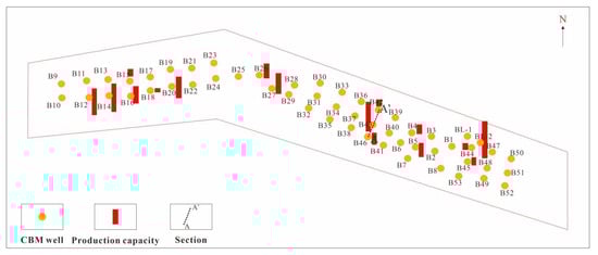 Coalbed methane is an unconventional clean energy source that can be used as a supplement to conventional natural gas, with huge reserves and widespread attention [,]. As the world’s largest coal-consuming and coal-producing country, China has a huge amount of coalbed methane resources, ranking third in the world behind Russia and Canada [,,]. According to the new round of national coalbed methane resource evaluation results, the geological resources in the coal layers of 30 major gas-bearing basins in China with a depth of less than 2000 m are 29.82 × 1012 m3 []. With the rapid development of the coalbed methane industry, the production capacity characteristics of gas wells and the factors affecting production capacity have gradually become key research issues.