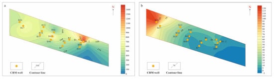 According to Figure 10a, the correlation between the gas production rate of CBM wells and the average burial depth of the target coal seam was nonlinear. With the increase in the burial depth, the gas production rate of CBM wells first increased and then decreased, and except for several wells with high water production, the water production rate had a complex trend of change (Figure 10b). The high water production rate of several wells may have been due to the high water content of the coal seams themselves in the central and western regions of the study area or the supply of nearby layers to the coal seams, resulting in high water production rate. The wells with relatively good productivity performance were concentrated in the range of 750–1000 m, and they could have an ADGP greater than 1000 m3/d, which has greater potential for CBM production.