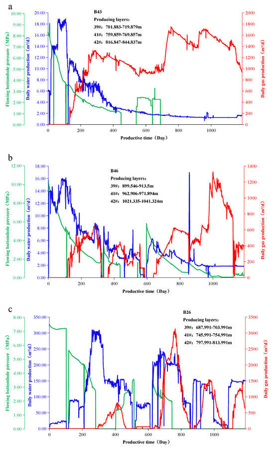 Five CBM wells belonged to type III, namely, B9, B26, B27, B42 and B44. Its higher water production may have been the direct reason for the low gas production. Taking the B26 well as an example (Figure 5c), after about 1 year of drainage, the water production rate was still as high as about 150 m3/d, while the gas production was only about 450 m3/d. The high water content of the coal seam caused the inability to reduce the bottom hole pressure, and thus, the gas was difficult to desorb and the gas production rate was reduced.