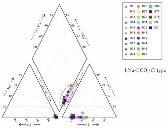 The cations of the produced coal seam water were dominated by Na+, followed by K+, and Ca2+ and Mg2+ had the lowest concentrations. The anions in the coal seam water were mainly HCO3− and Cl−, followed by , and was not detected. The pH value ranged from 6.88 to 8.02, with an average of 7.5, indicating the coal seam water was weakly alkaline. The chemical characteristics of the coal seam water in the BYR block were similar to those of coal seam water in global continental environments [,]. Based on the concentrations of anions and cations in the co-produced water samples, a Piper diagram of hydrochemical compositions in the BYR block (Figure 6) was drawn to determine the type of water. It can be seen from Figure 6 that all the water samples in the BYR block were Na-HCO3-Cl type, and the proportion of HCO3− in the anions was significantly higher than that of Cl−. The TDS values of the co-produced water were very high, distributed between 5841 and 27,203 mg/L, with an average of 19,030 mg/L. The TDS values were increased sequentially from east to west and from north to south. The south wing of the syncline was inverted by the reverse thrusting of Bogda Mountain, and most coal measure strata were lost due to fault cutting. The dip angle of the formation on the north wing could reach 75°, which was conducive to the migration of surface water along the coal seams to the synclinal core and forming a stagnant flow zone.