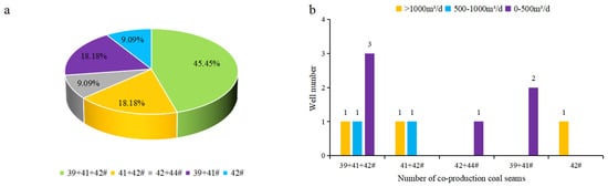 There are various combinations of coal seams for CBM drainage in this area. As shown in the statistical diagram of the proportion of the co-production coal seam number (Figure 11a), the CBM wells drainage in the study area mainly displayed multi-layer co-production and the three-layer co-production accounted for the largest proportion.