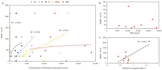 In the newly established productivity response index δ* formula (Formula (1)), the TDSs are introduced as a parameter, which can reflect the burial depth of the formation. In the study area, with the increase in TDSs, the ADGP showed a trend of first increasing and then decreasing. Compared with the concentration values of Ca2+, Mg2+ and , the TDS values were large, and thus, the productivity response index δ* could also be approximately expressed as