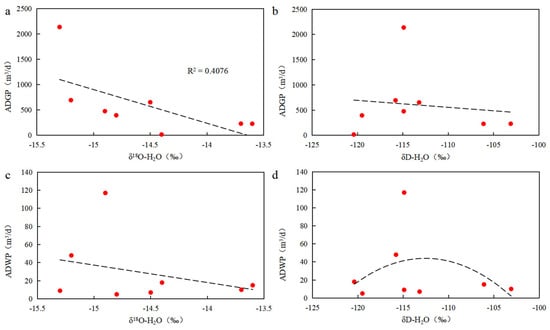 Relationship between isotopic composition and the average daily gas and water production. (a) Relationship between δ18O-H2O and average daily gas production; (b) relationship between δD-H2O and average daily gas production; (c) relationship between δ18O-H2O and average daily water production; (d) relationship between δD-H2O and average daily water production. The red dots represent the data in Table 2, the dashed lines represent the trend line of the data points.