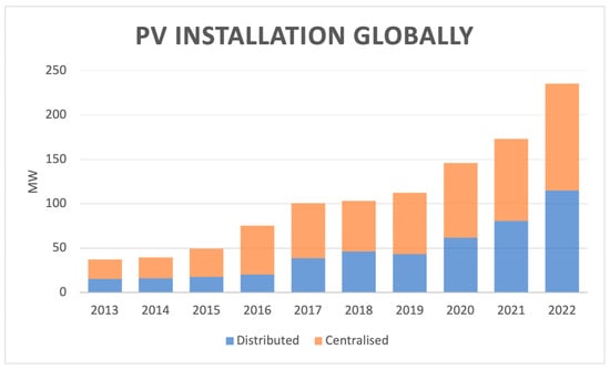 Evolution of PV installation globally segmented between distributed and centralised. Source: IEA PVPS 2023 []. Reproduced with permission from IEA PVPS (Task 1 Strategic PV Analysis and Outreach), from Snapshot of Global PV Markets 2023; published by IEA PVPS, 2023.