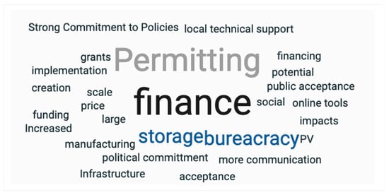 Word cloud of challenges to deploying solar PVs faster from some of the live participants at COP27 EU side event on PVs. Source: own elaborations on feedback from COP27 side event participants.