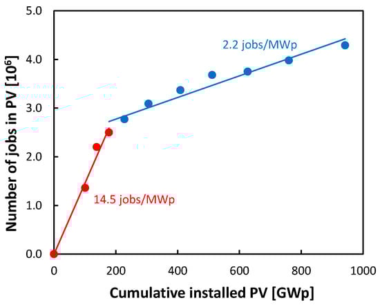 Number of jobs in millions in Photovoltaics per GWp of cumulative installed PVs. The red datapoints and trendline show the trend until the year 2014, whereas the blue datapoints show this trend from the year 2015 onwards. Source: own elaboration based on [,].